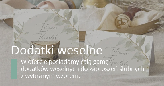 W naszej ofercie oprócz oryginalnych zaproszeń na ślub, znajdą Państwo także dodatki weselne, dopasowane motywem przewodnim do zaproszeń oraz do stylu uroczystości. Winietki z imionami i nazwiskami Gości, które wskażą im miejsce przy stole, zawieszki na alkohol z zabawnymi wierszykami zachęcającymi do wspólnych toastów przy stole, numery na stół, menu weselne, pudełka na placki lub naklejki na ciasto, pamiątkowe Księgi Gości i praktyczne plany stołów, pomagające Gościom w poruszaniu się po sali. Kupując nasze dodatki weselne mogą Państwo trzymać się jednego motywu przewodniego lub mieszać ciekawie nasze wzory, które stworzą niesztampowe, oryginalne ozdoby stołów i sali weselnej.