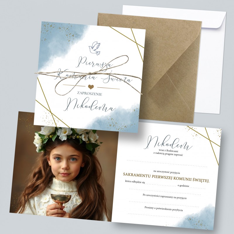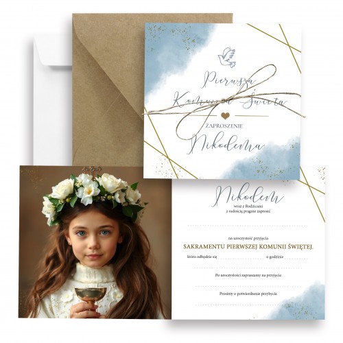 Zaproszenia na Komunię Święta ze zdjęciem z KREAOREM - wzór Dusty Blue