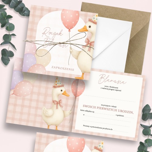 Zaproszenia Urodzinowe na Pierwsze Urodziny Roczek Dziecka - wzór Little Goose Pink