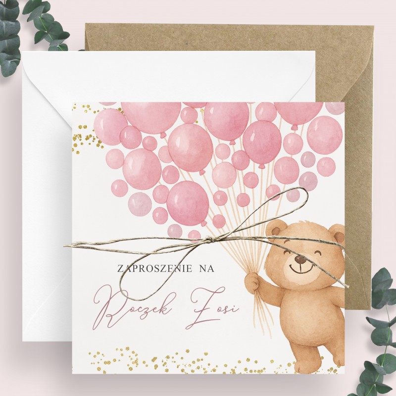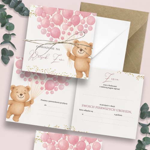 Zaproszenia Miś Sparkle Pink 24h na Pierwsze Urodziny Roczek Dziecka